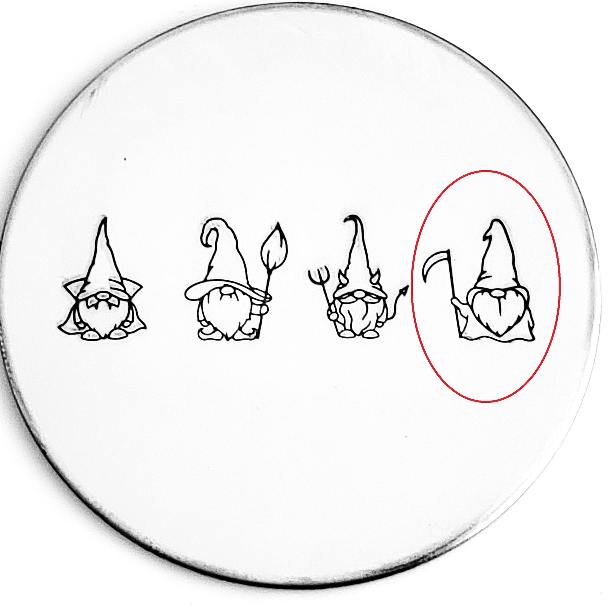 Our Halloween Gnome metal stamps may be cute, but they are each on a sinister mission! To overtake the garden to enslave all the magical creatures! Choose among the following Halloween-y Gnome hand stamps: Vampire, Witch, Devil, and Undertaker!